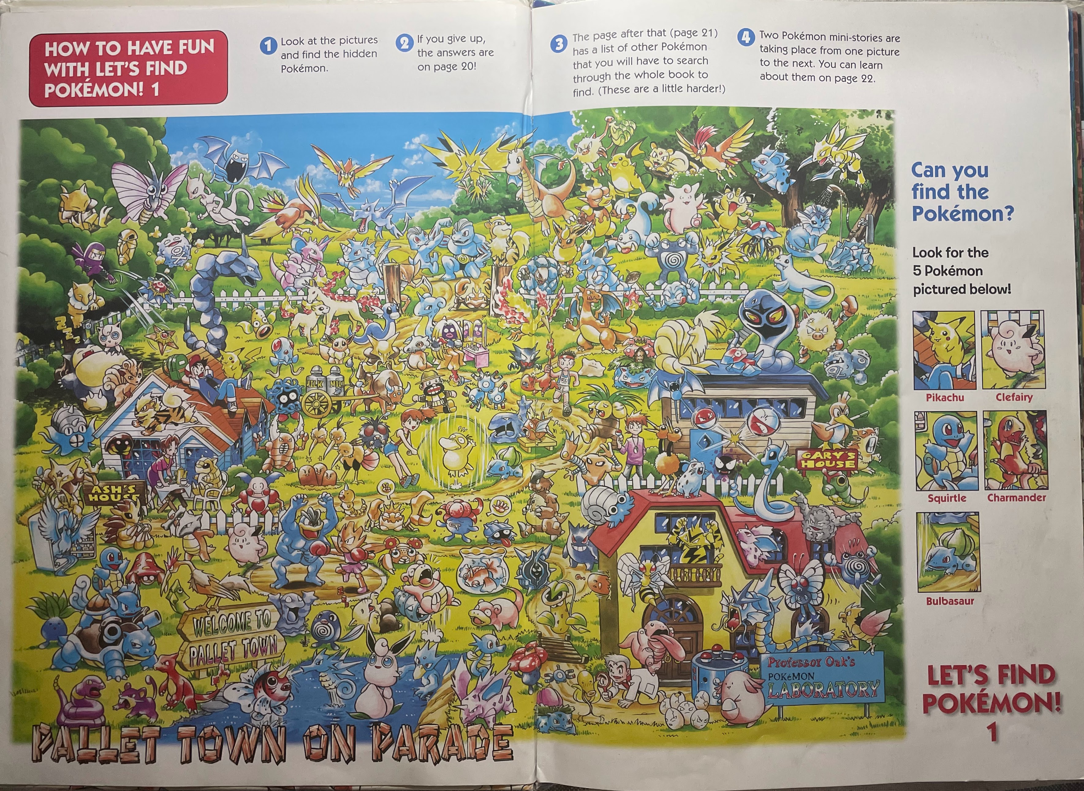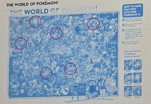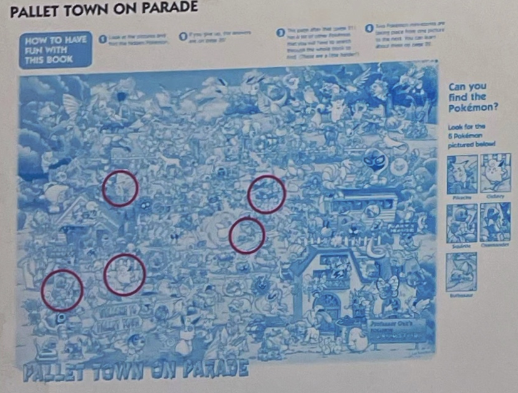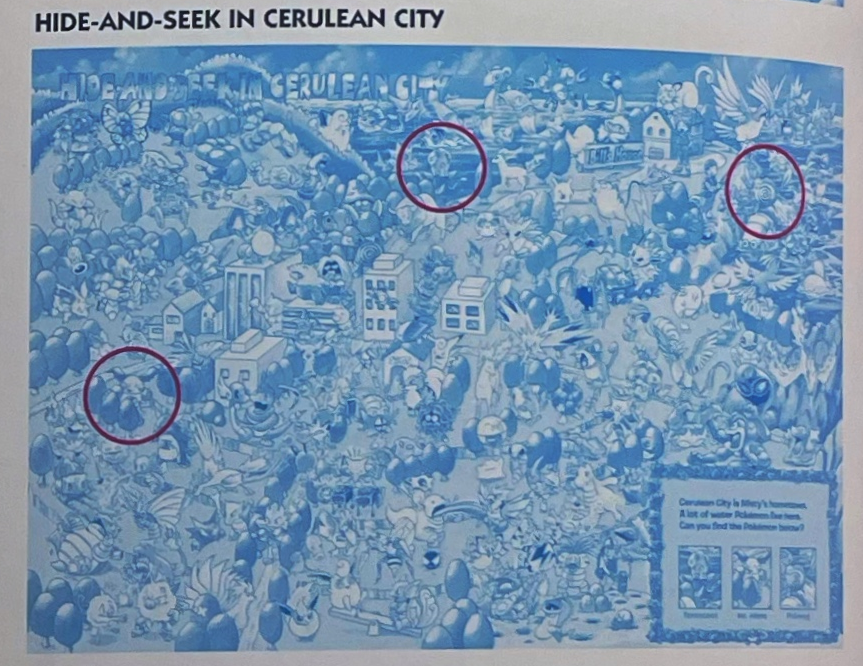 note: This page contains pages and info from Let's Find Pokemon! (1999), Let's Find Pokemon! 2 (2000), and Let's Find Pokemon! 3 (2000). Let's Find Pokemon! Special Complete Edition (2006) is a collection of these 3 books published in North America and I found it redundant to include each one of these books. If I find any information about changes made between Find! 1, 2, and 3 and the publishing of the Special Complete Edition- I will make a note of it!