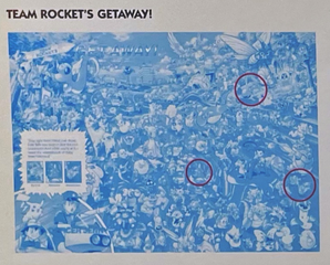 Let's Find Pokemon! Complete Edition has 86 pages and 32 full scenes. It is composed of 3 distict books: Let's Find Pokemon! (1999), Let's Find Pokemon! 2 (2000), and Let's Find Pokemon! 3 (2000). Most scenes contain 149-151 Pokemon- few contain Mew and Mewtwo and a few feature only 1-6 specific 'mons. Most scenes ask you to find 3 specific pokemon hidden in the chaos, sometimes asking you to complete another puzzle task having to do with the layout of the scene. There are a series of plots that range through the entire book which you can learn more about in extras.