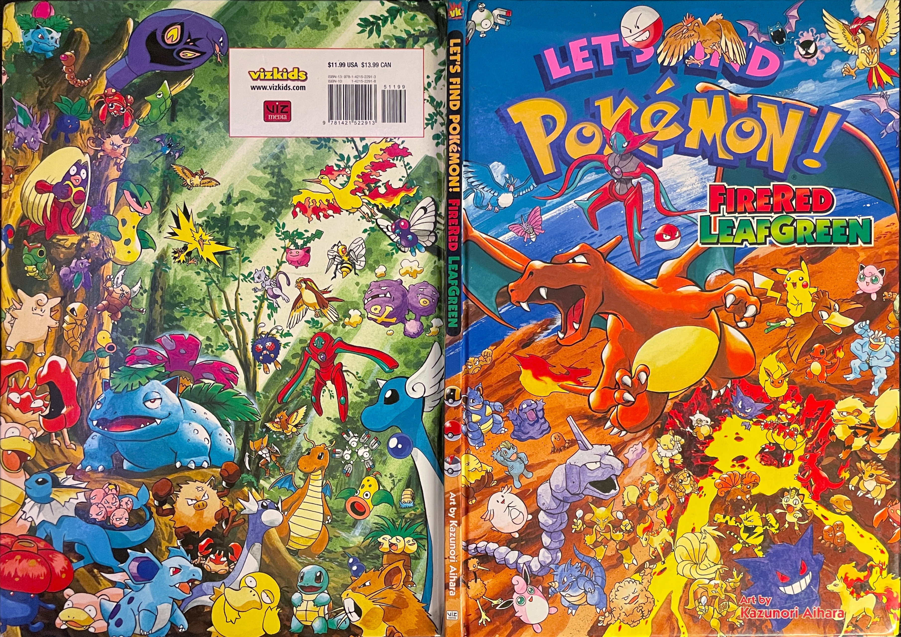 Let's Find Pokemon! Fire Red Leaf Green was published by VIZ Media in North America on September 16, 2008 and by Shogakukan Inc. in Japan on August 25, 2004. It has 31 pages and 11 full scenes. These scenes contain Pokemon and key locations from Kanto. 3 pages in these books also feature Pokemon from Johto! Most scenes ask you to find 3 specific pokemon hidden in the chaos, sometimes asking you to complete another puzzle task having to do with the layout of the scene. There are a series of plots that range through the entire book which you can learn more about in extras. This is the 5th "Let's Find Pokemon!" book set in Kanto! This book strongly features NPCs featured in these games, such as Youngsters and Pokemaniacs.