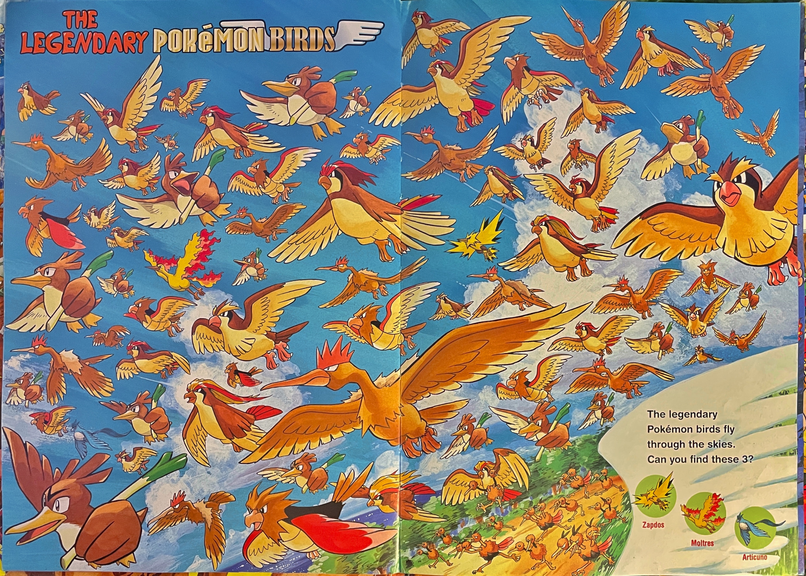 Types of Pokemon in image: 10! (pidgey, pidgeotto, pidgeot, spearow, fearow, doduo, dodrio, fardetch'd, articuno, zapdos, moltres