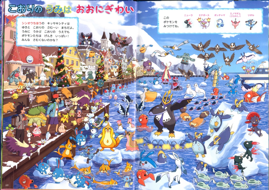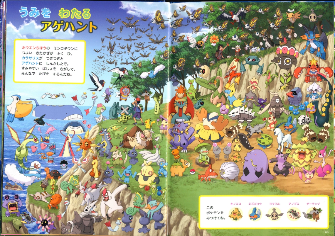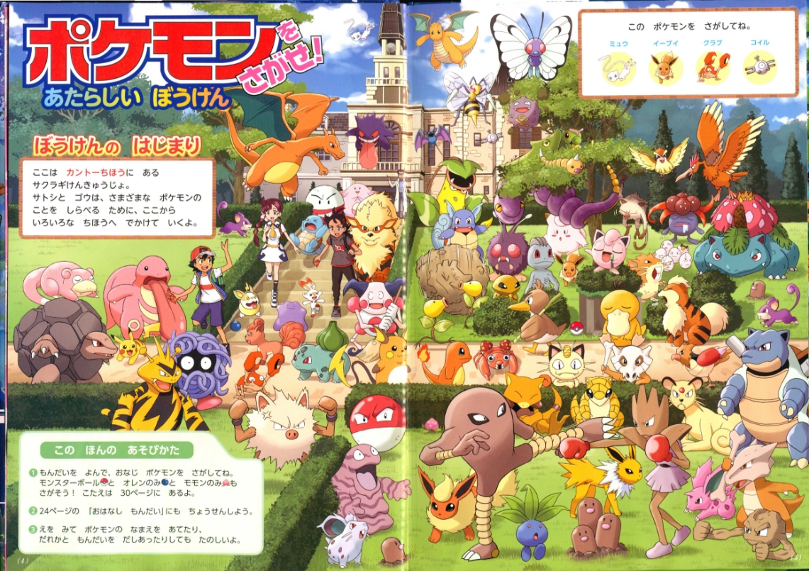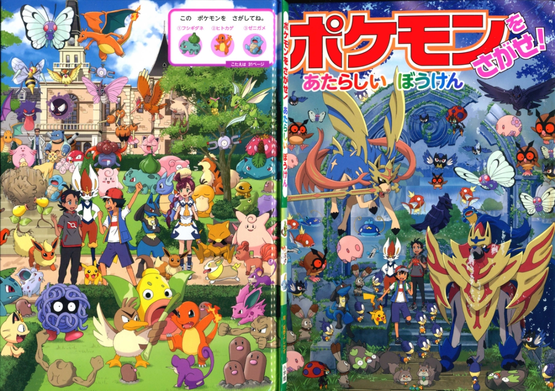 Find Pokemon! A New Adventure (or "ポケモンをさがせ! あたらしいぼうけん") was published by Shogakukan Inc. in Japan on December 16th, 2008. It has yet to be translated to English or published in North America. It has 31 pages and 11 full scenes, including the scene on the cover. These scenes contain Pokemon and key locations from the Kanto, Johto, Hoenn, Sinnoh, Unova, Alola, and Galar region. Interestingly, though Pokemon FROM Kalos are featured, no scenes from the Kalos region are featured.