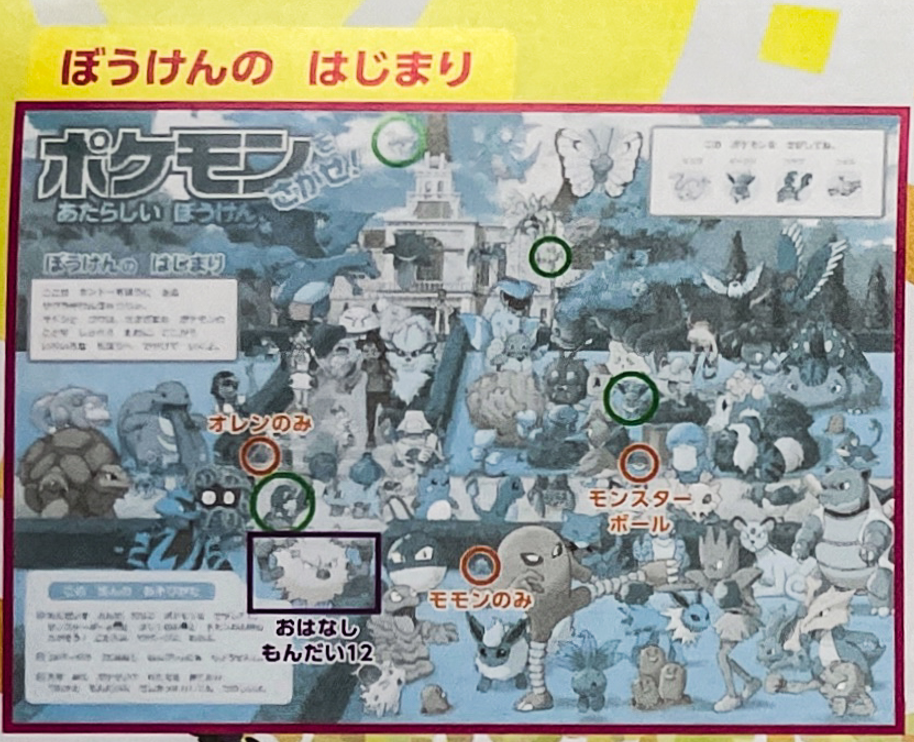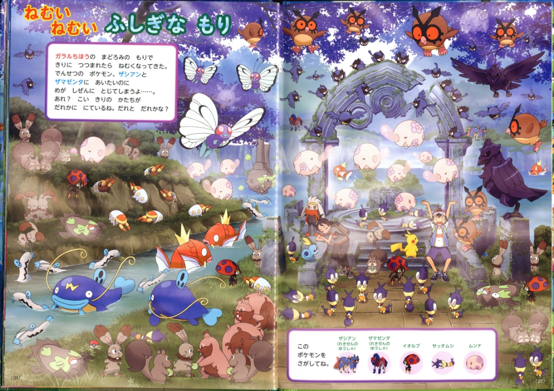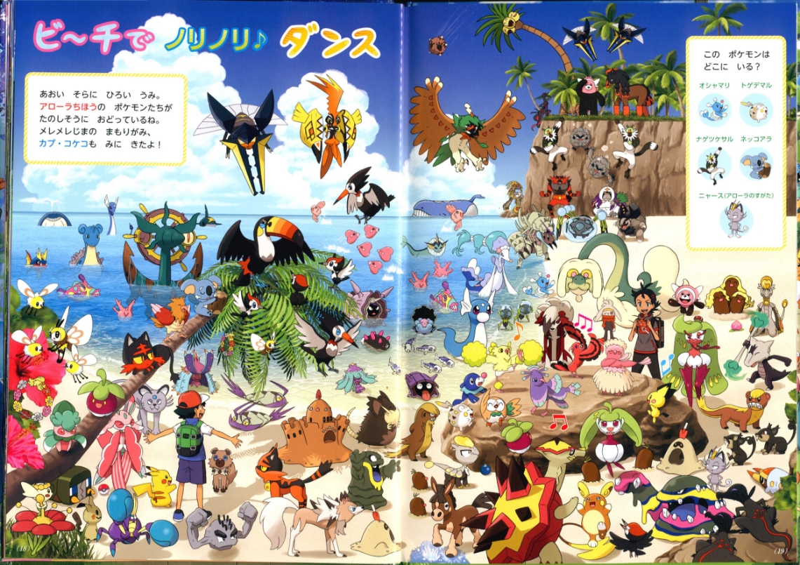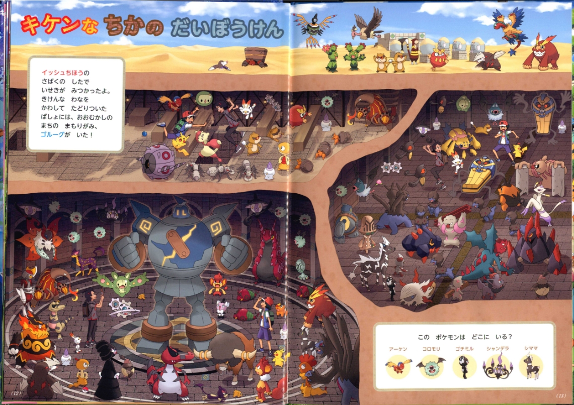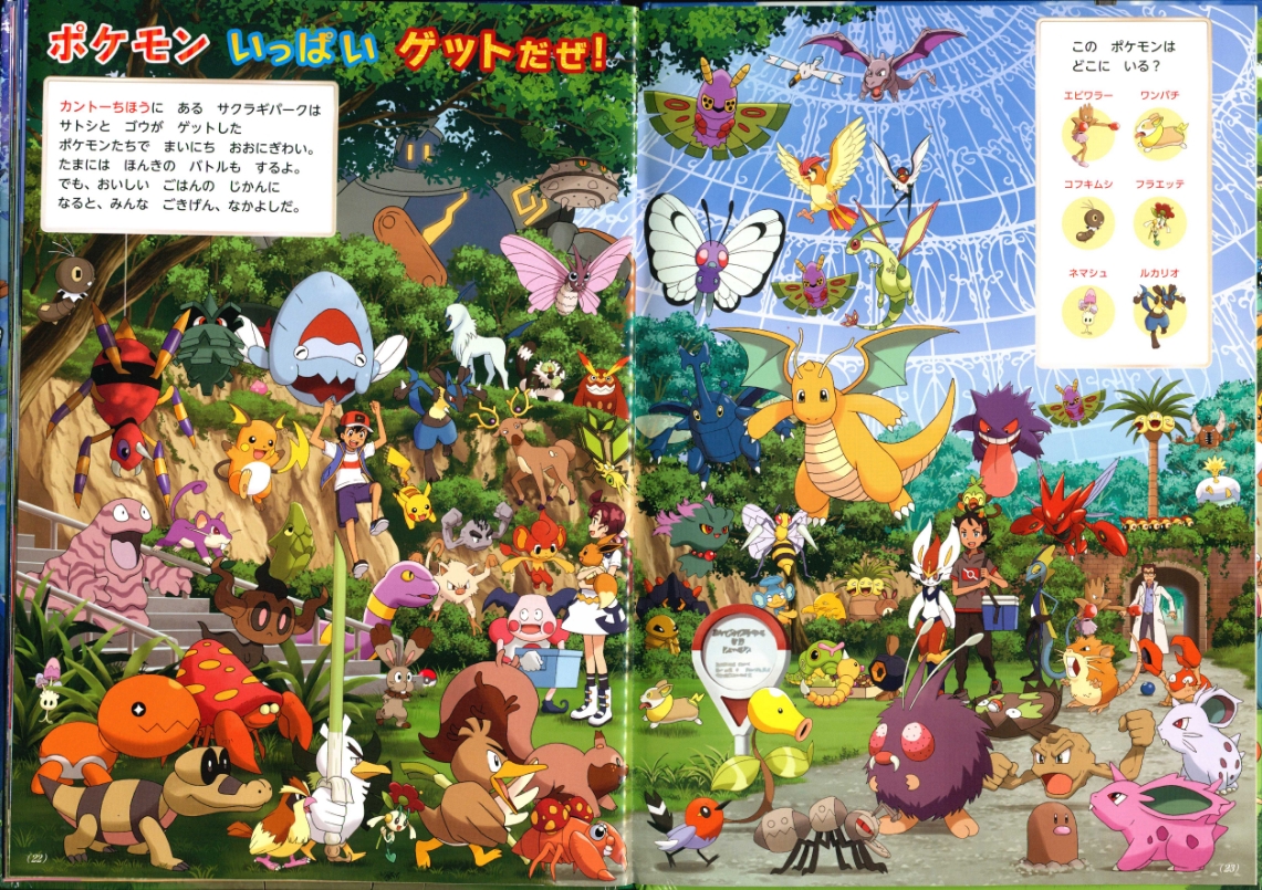 Find Pokemon! A New Adventure (or "ポケモンをさがせ! あたらしいぼうけん") was published by Shogakukan Inc. in Japan on December 16th, 2008. It has yet to be translated to English or published in North America. It has 31 pages and 11 full scenes, including the scene on the cover. These scenes contain Pokemon and key locations from the Kanto, Johto, Hoenn, Sinnoh, Unova, Alola, and Galar region. Interestingly, though Pokemon FROM Kalos are featured, no scenes from the Kalos region are featured.