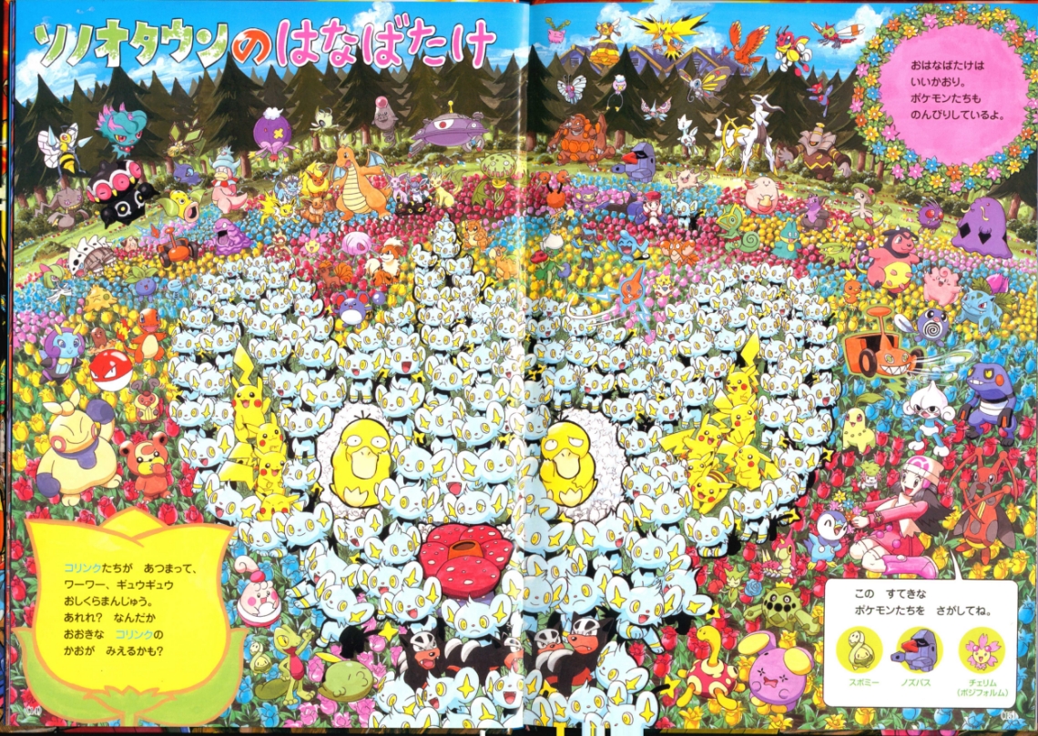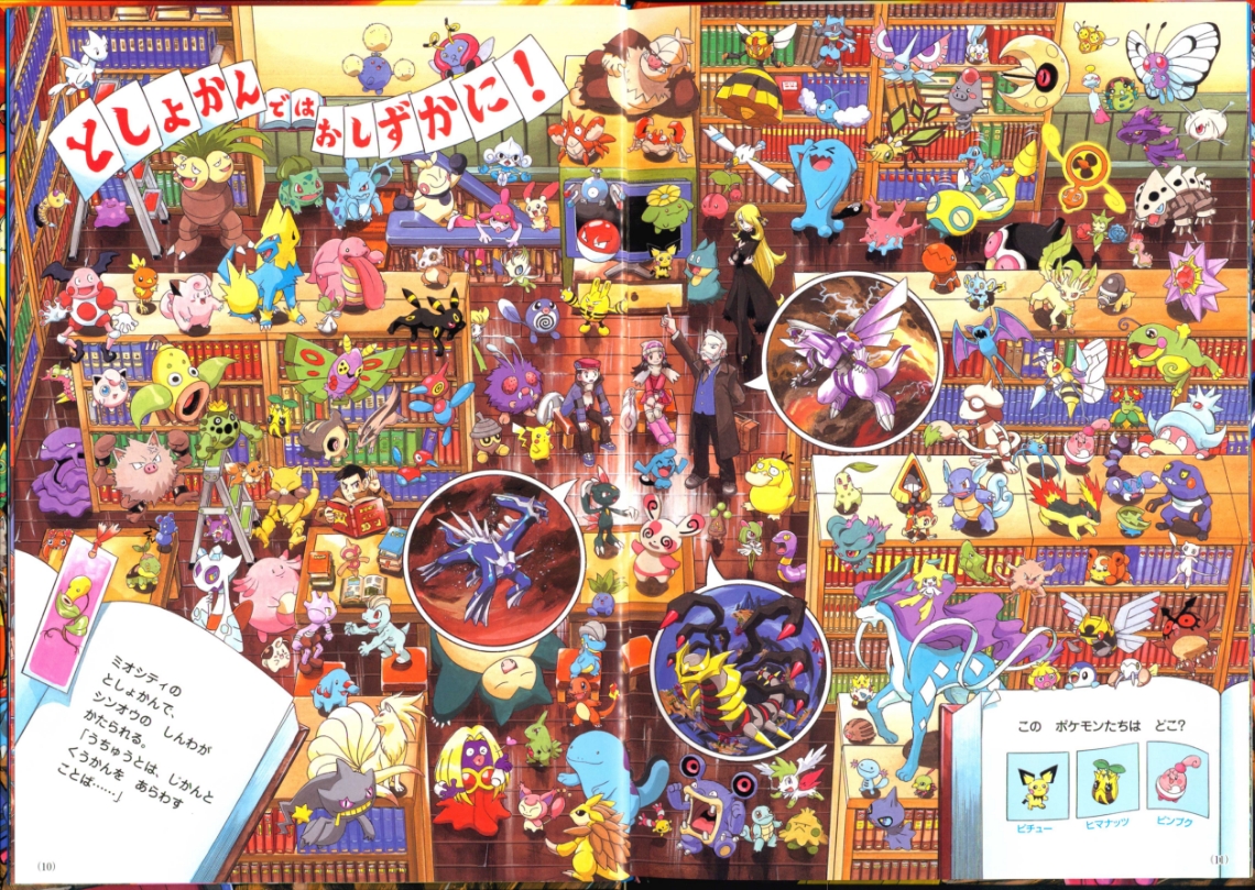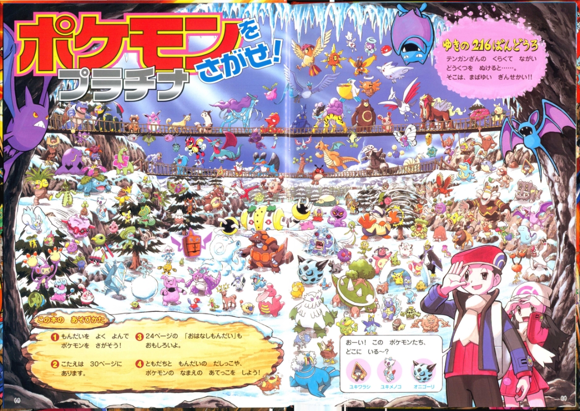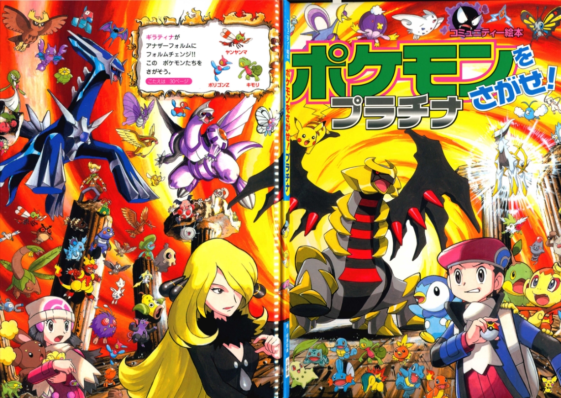 Find Pokemon! Platinum (or "ポケモンをさがせ! ") was published by Shogakukan Inc. in Japan on March 25th, 2010. This is the 11th "Find Pokemon!" book. It has 31 pages and 11 full scenes, including the cover as its own scenes. These scenes contain Pokemon and key locations from the Sinnoh region. Most scenes ask you to find 3 specific pokemon hidden in the chaos, sometimes asking you to complete another puzzle task having to do with the layout of the scene. There are a series of plots that range through the entire book which you can learn more about in Extras.