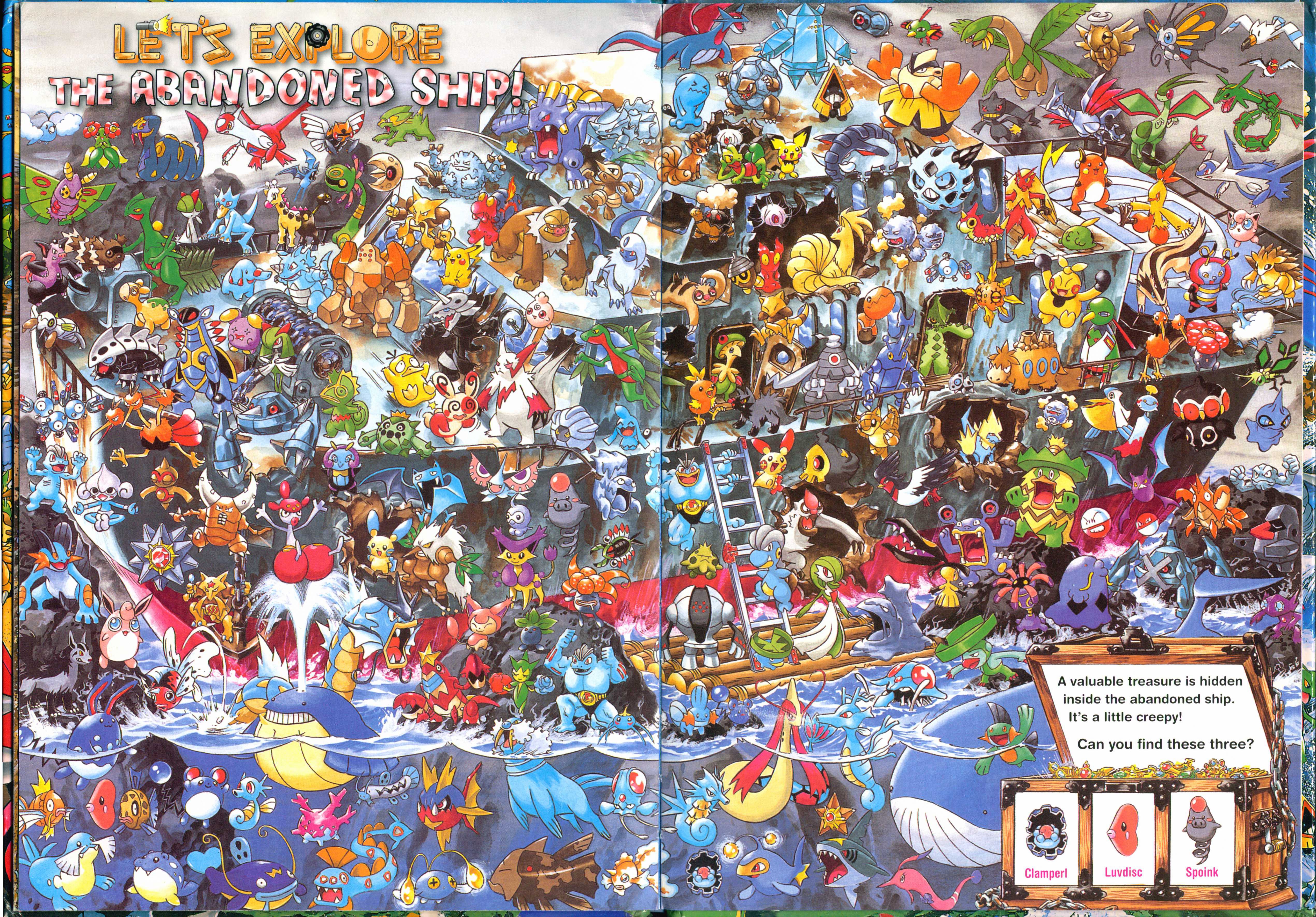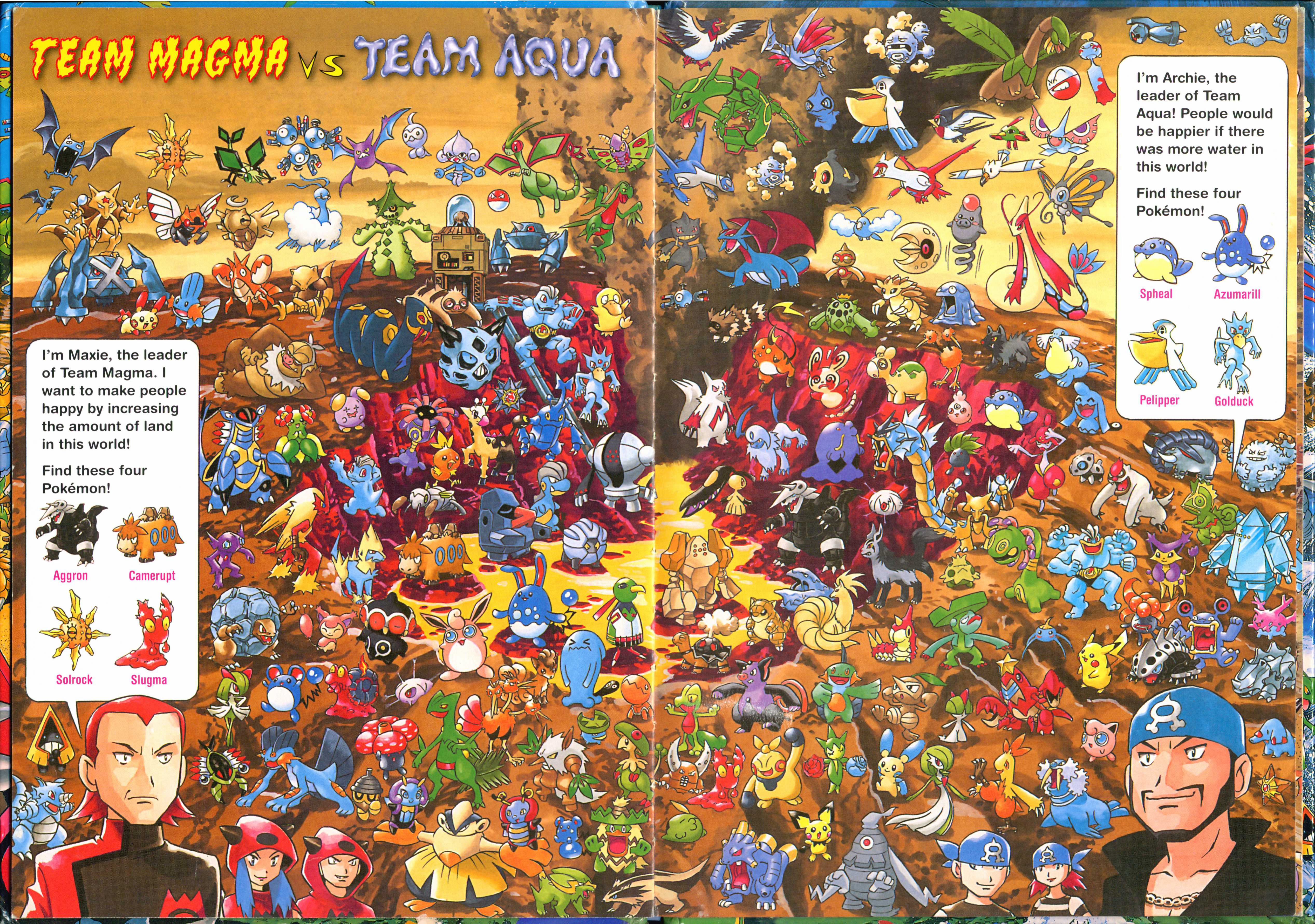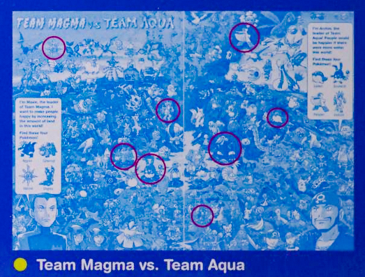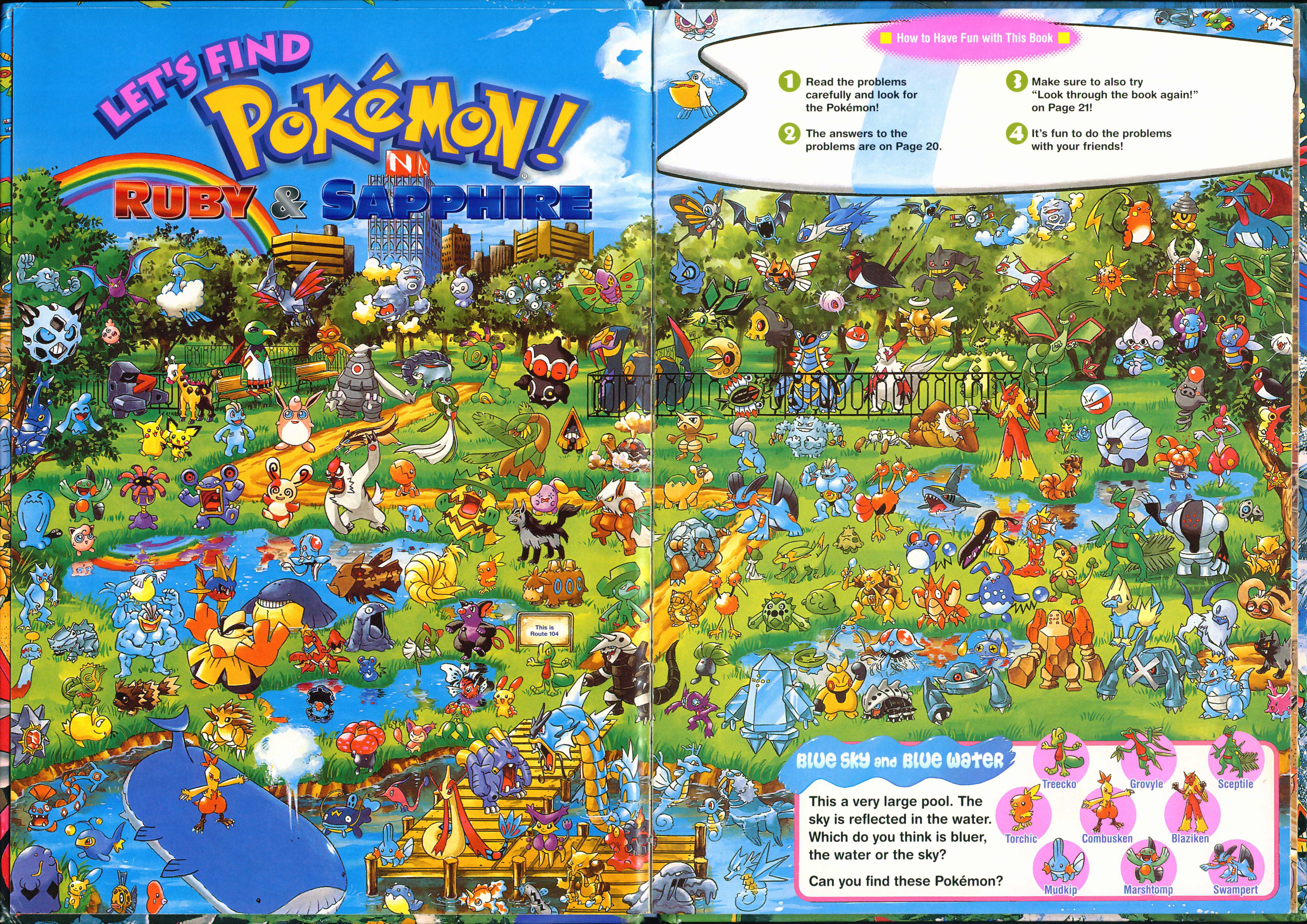 Let's Find Pokemon! Ruby & Sapphire was published by VIZ Media in North America on September 1, 2009 and by Shogakukan Inc. in Japan on December 12, 2003 . It has 23 pages and 8 full scenes. These scenes contain Pokemon and key locations from the Hoenn Region. Most scenes ask you to find 3 specific pokemon hidden in the chaos, sometimes asking you to complete another puzzle task having to do with the layout of the scene. There are a series of plots that range through the entire book which you can learn more about in extras.