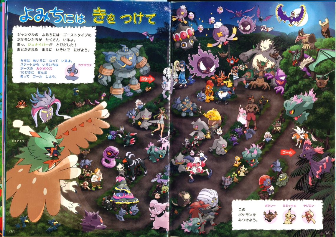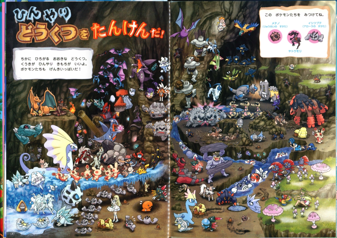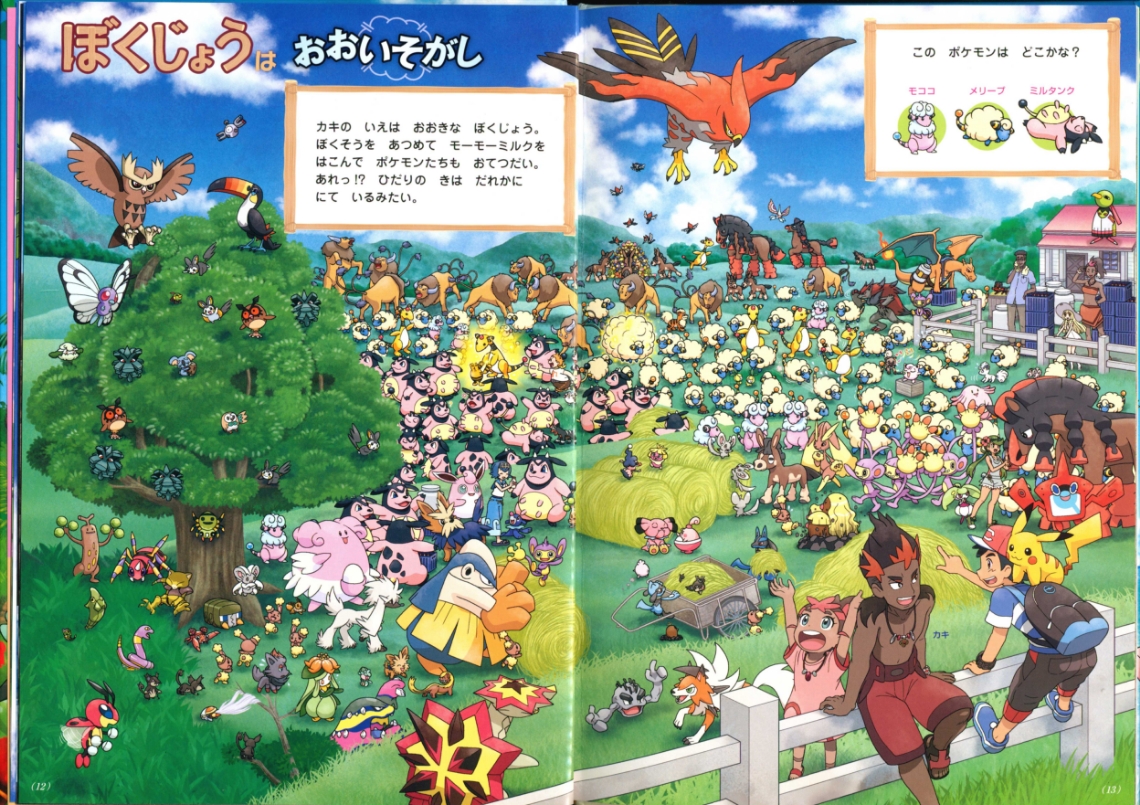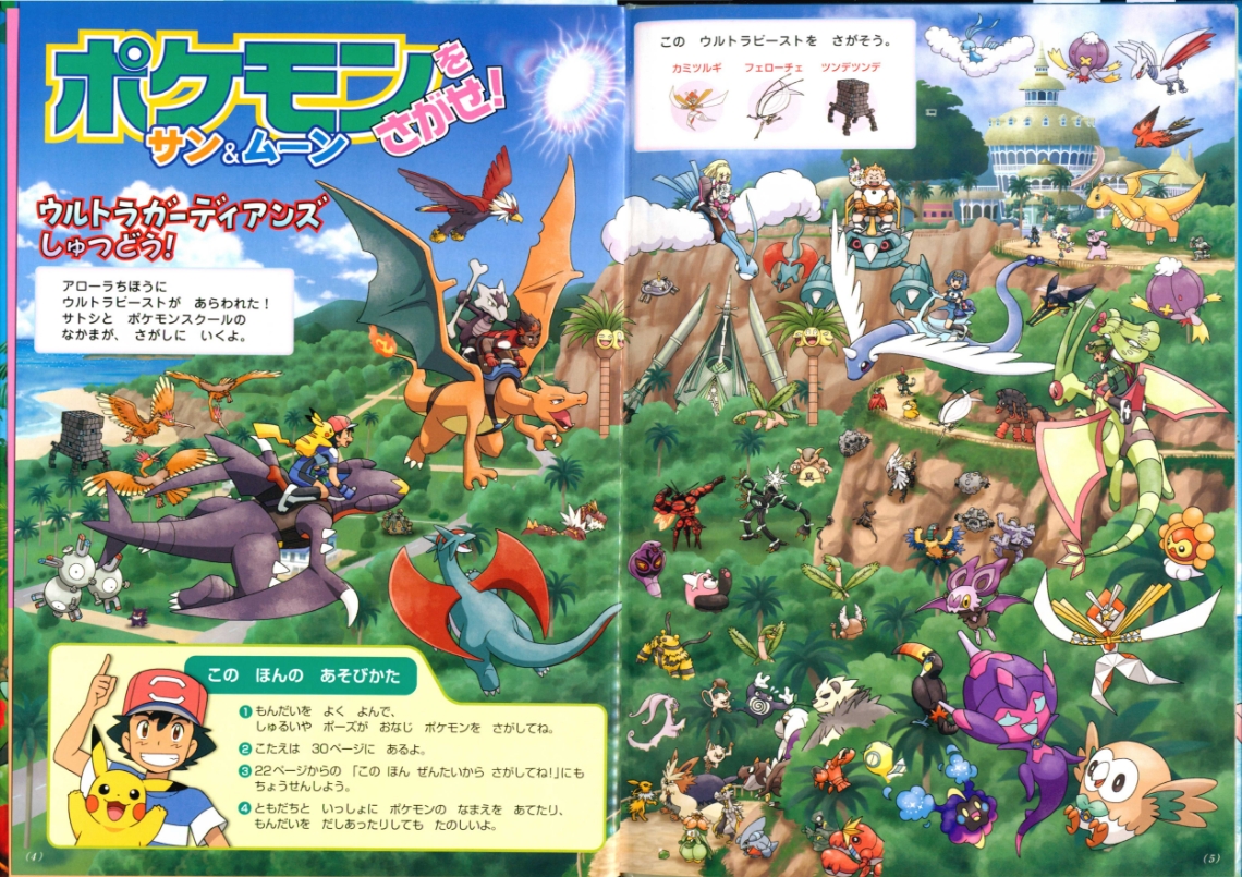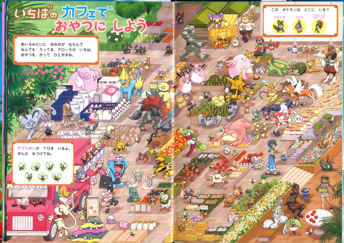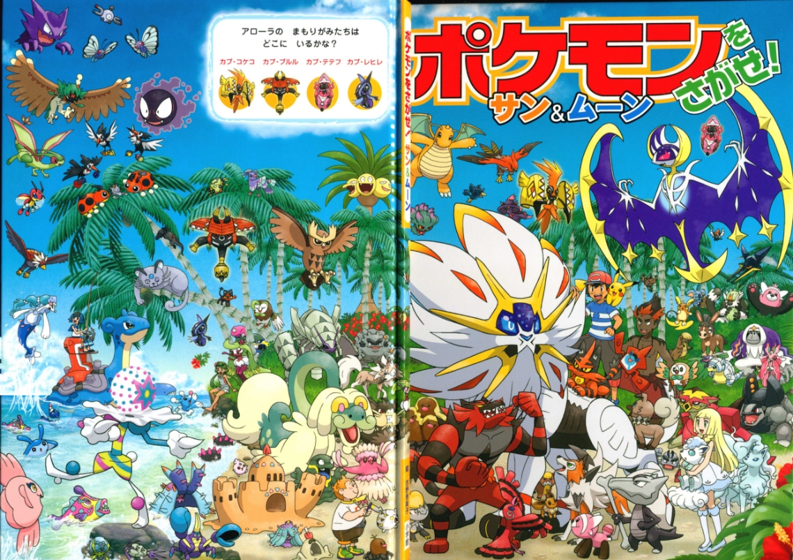 (google translate: This is the 13th installment in the popular series that has sold over 4.2 million copies. More than 1,200 Pokémon spend their time in the Alola region, which is rich in nature, including the ocean, jungles, volcanoes, ranches, and caves, with various poses and expressions. Many Ultra Beasts will also appear! In addition to searching and playing, there are also mazes, hidden pictures, and stories, making it a lot of fun. Even after you find the Pokemon in the questions, you can have plenty of fun by memorizing their names in the list of Pokemon that appear at the beginning and end of the book, and searching for the Pokemon listed throughout the book.)