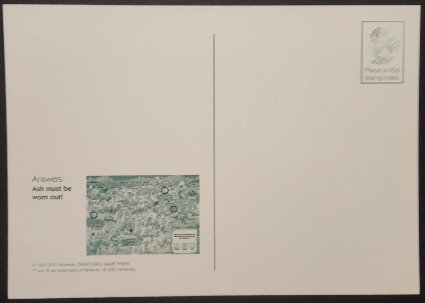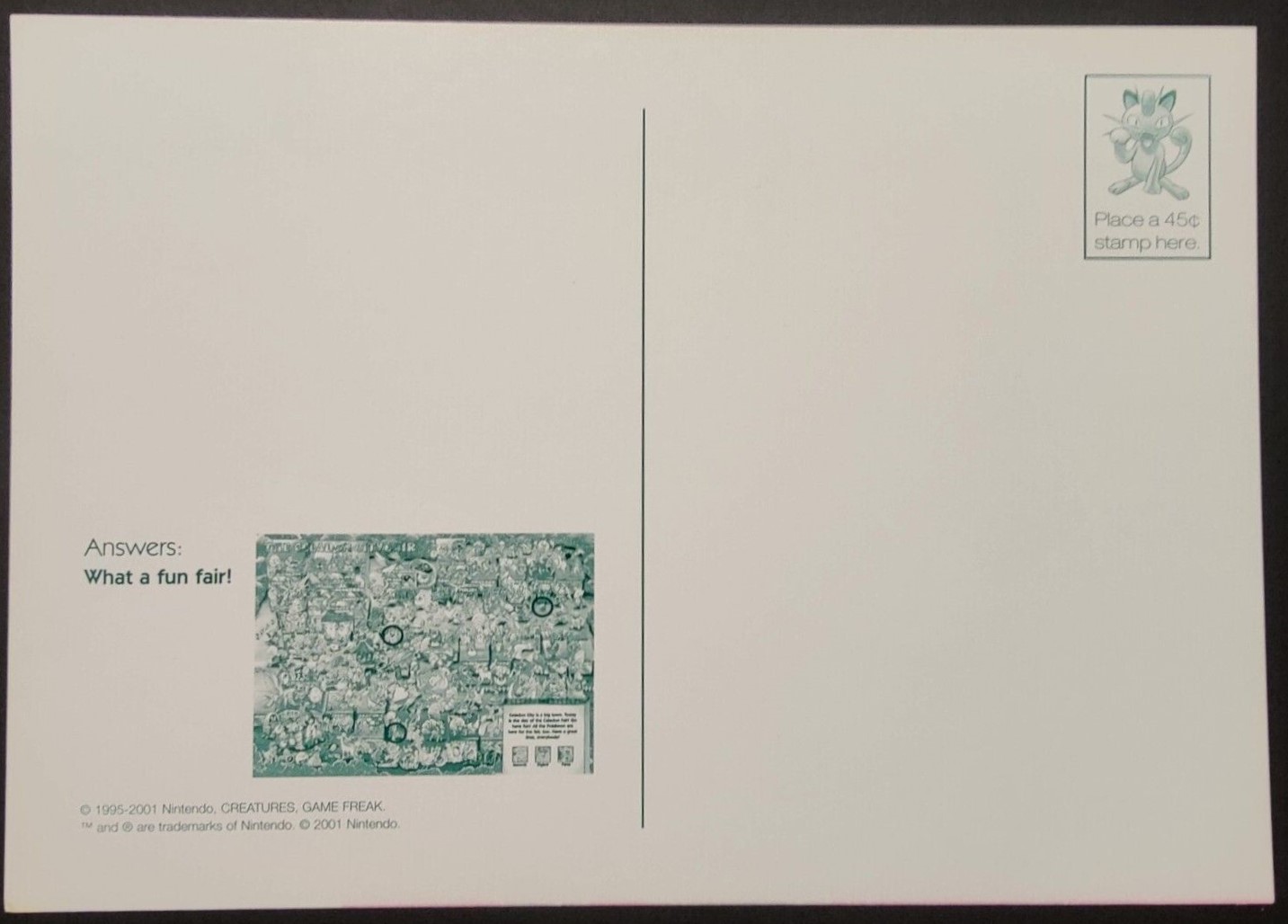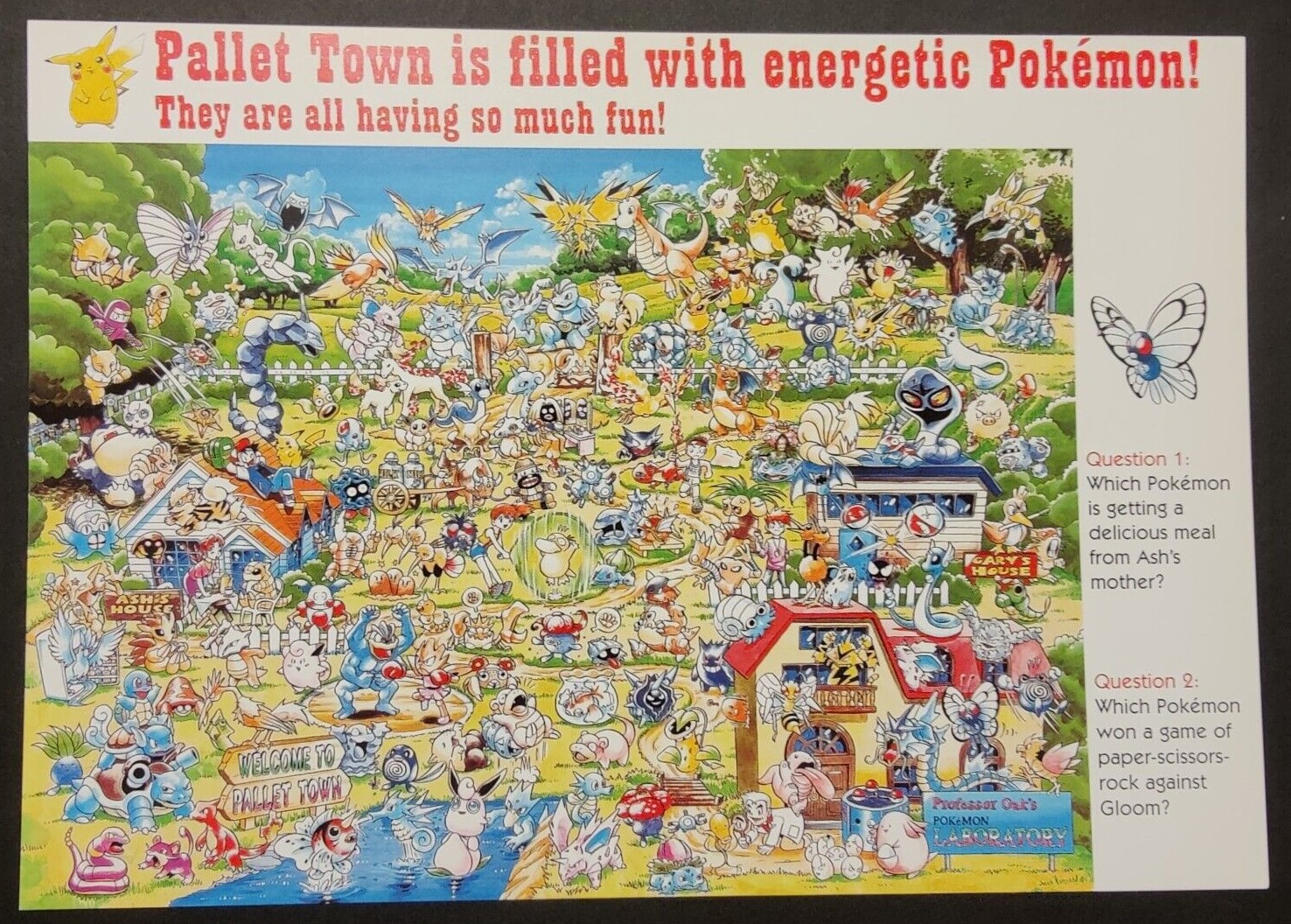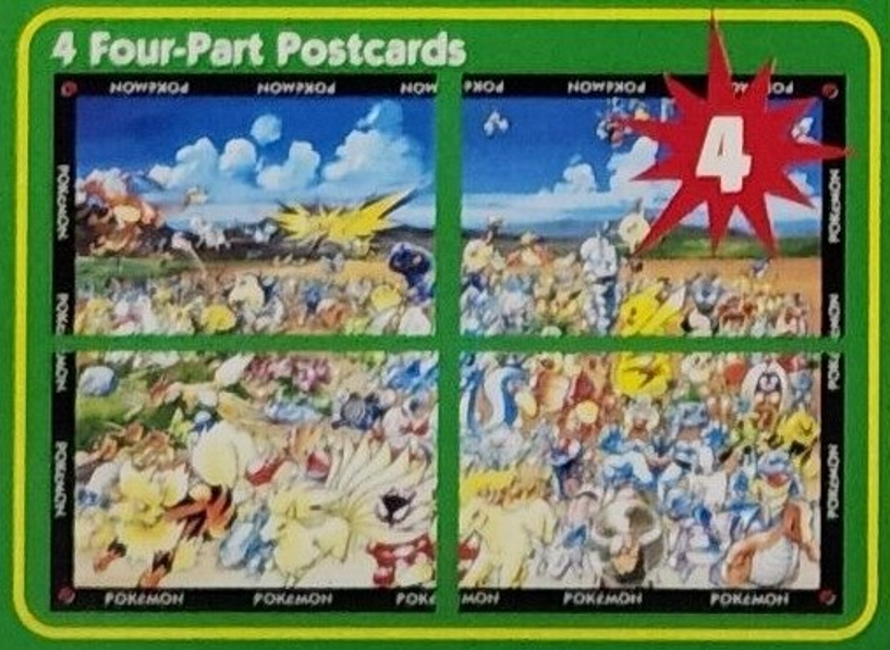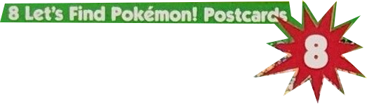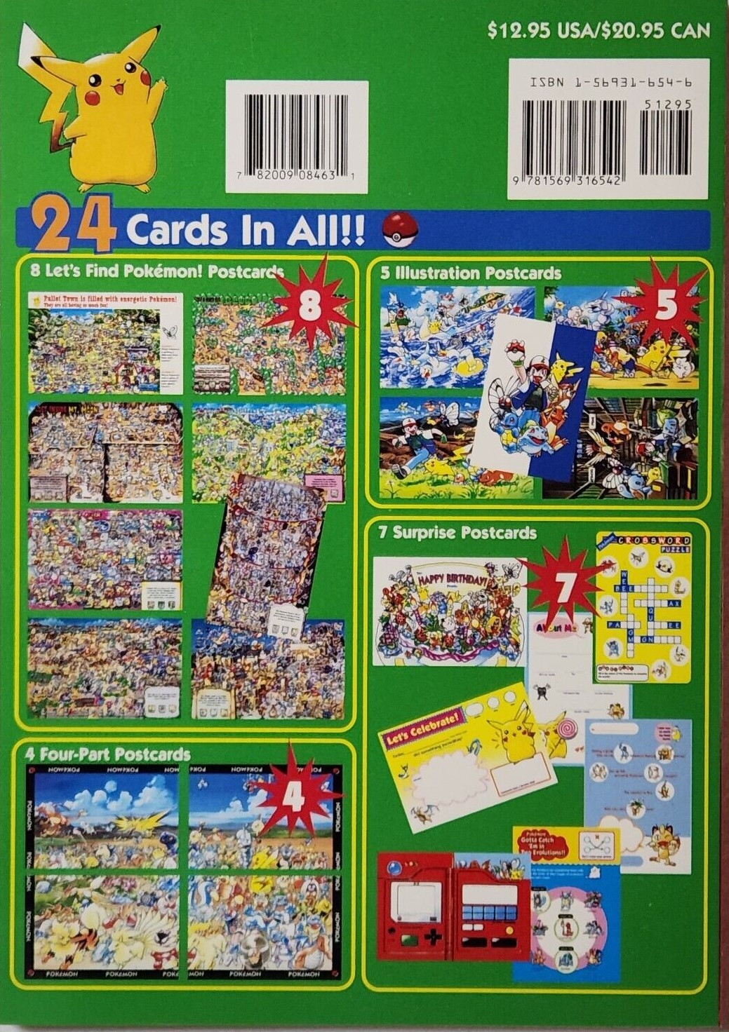 As detailed on the back - 8 of the postcards are scenes found in "Let's Find Pokemon! 1", 4 come together to form 1 large poster (the cover of the postcard book and Let's Find Pokemon! 1 without the text), 5 are (as far as I can tell) orignal illustrations, and the remaining 7 are an assortment of cards ranging from specific occassions (birthday and general celebrations), small activities (crossword puzzle, about me "mad lib", a word puzzle), to pokemon series concepts (Pokedex and evolution).