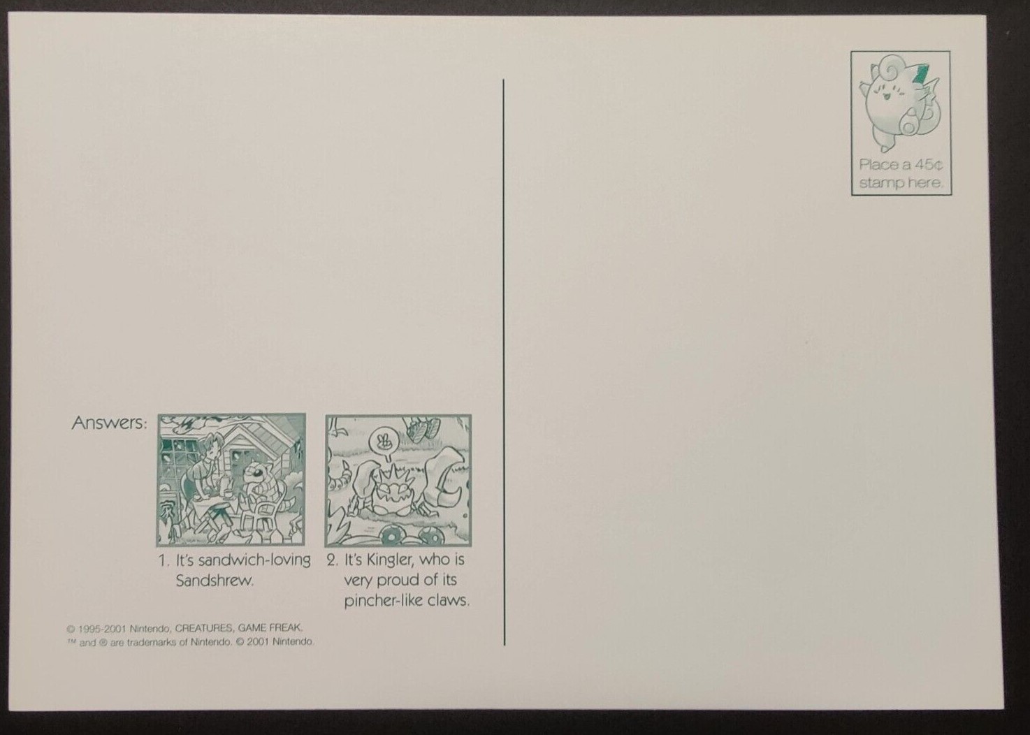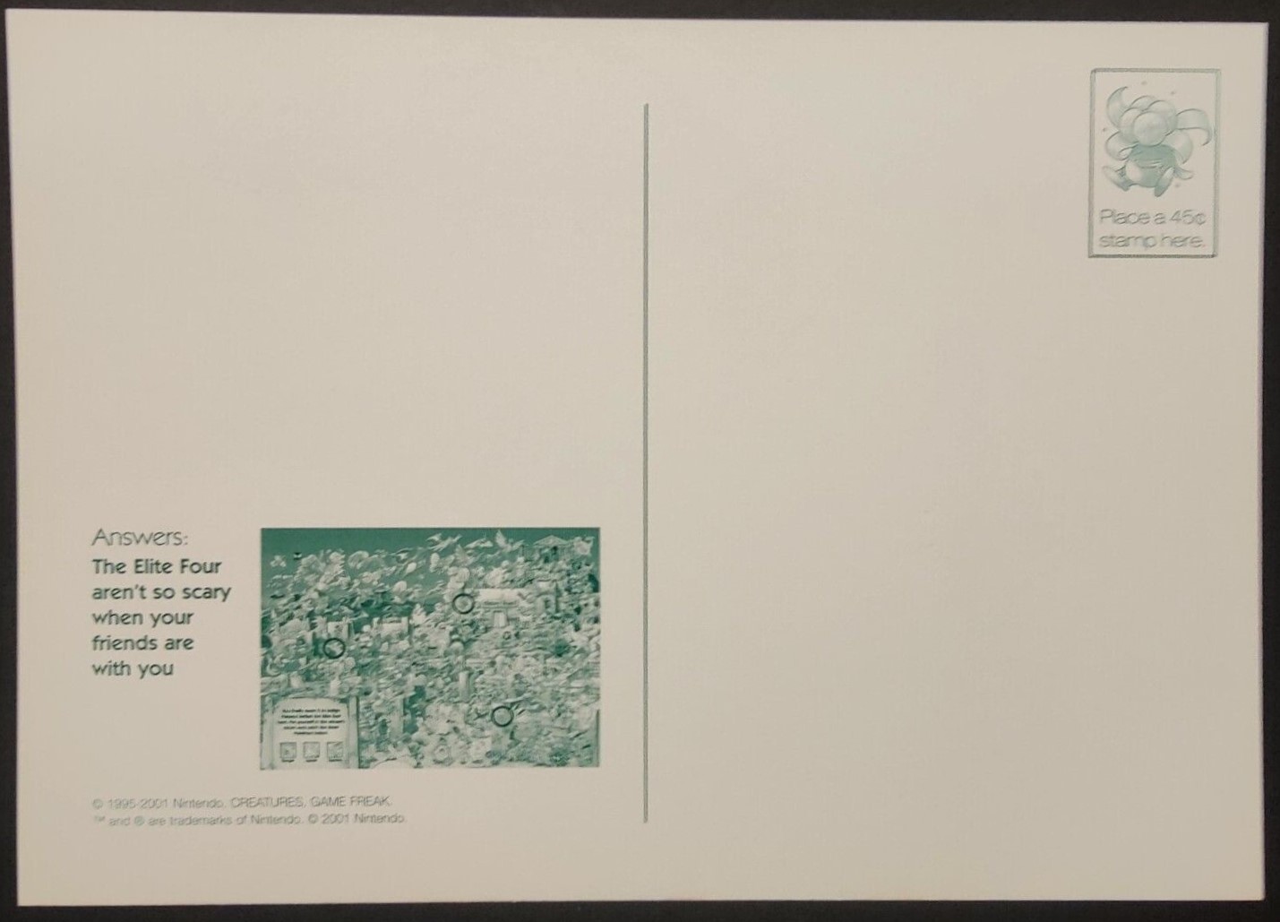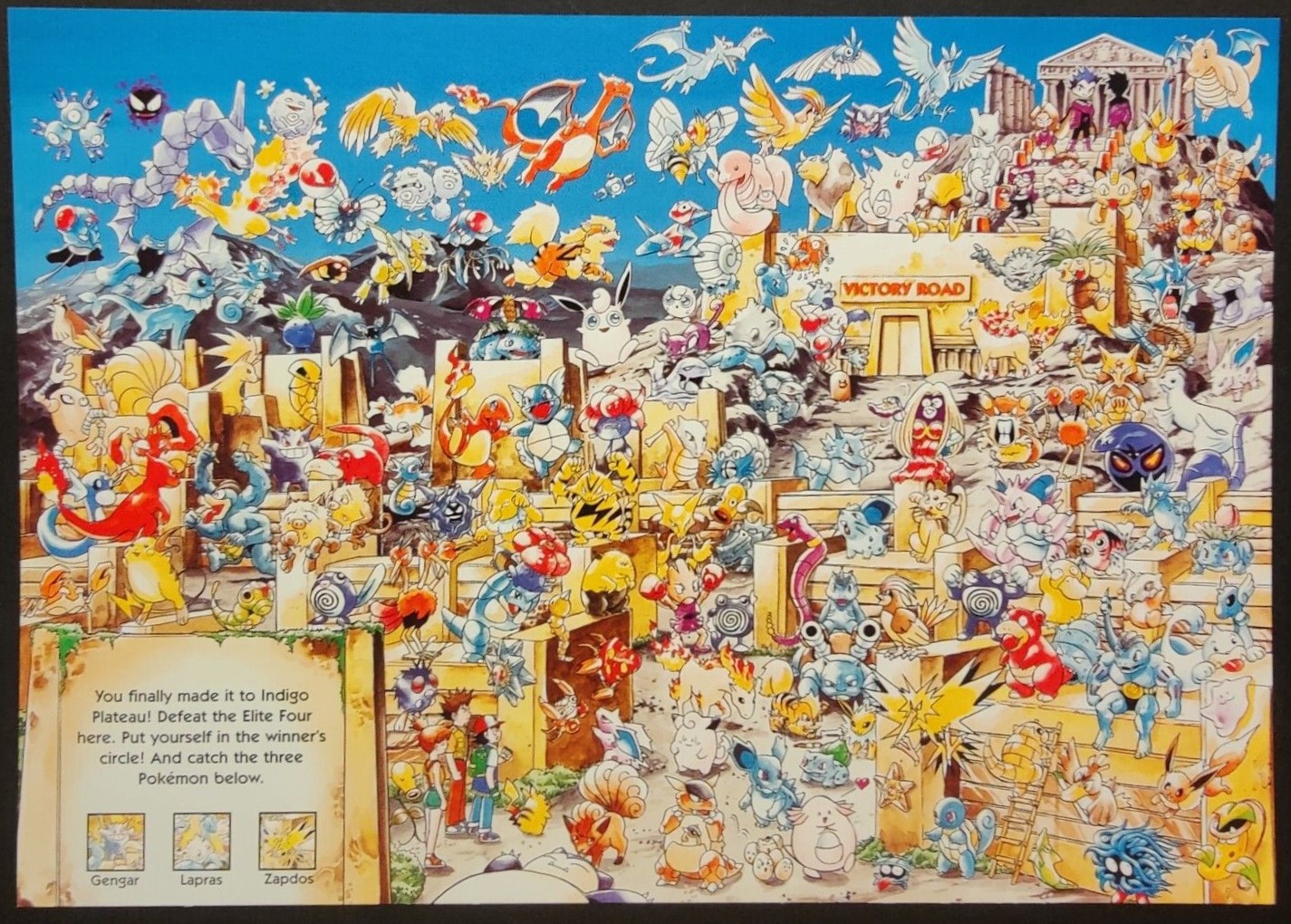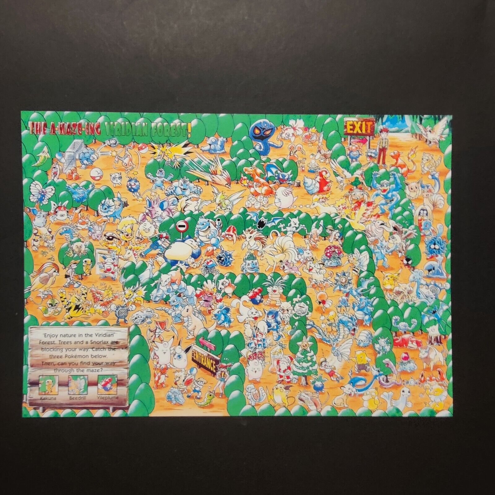 As detailed on the back - 8 of the postcards are scenes found in "Let's Find Pokemon! 1", 4 come together to form 1 large poster (the cover of the postcard book and Let's Find Pokemon! 1 without the text), 5 are (as far as I can tell) orignal illustrations, and the remaining 7 are an assortment of cards ranging from specific occassions (birthday and general celebrations), small activities (crossword puzzle, about me "mad lib", a word puzzle), to pokemon series concepts (Pokedex and evolution).